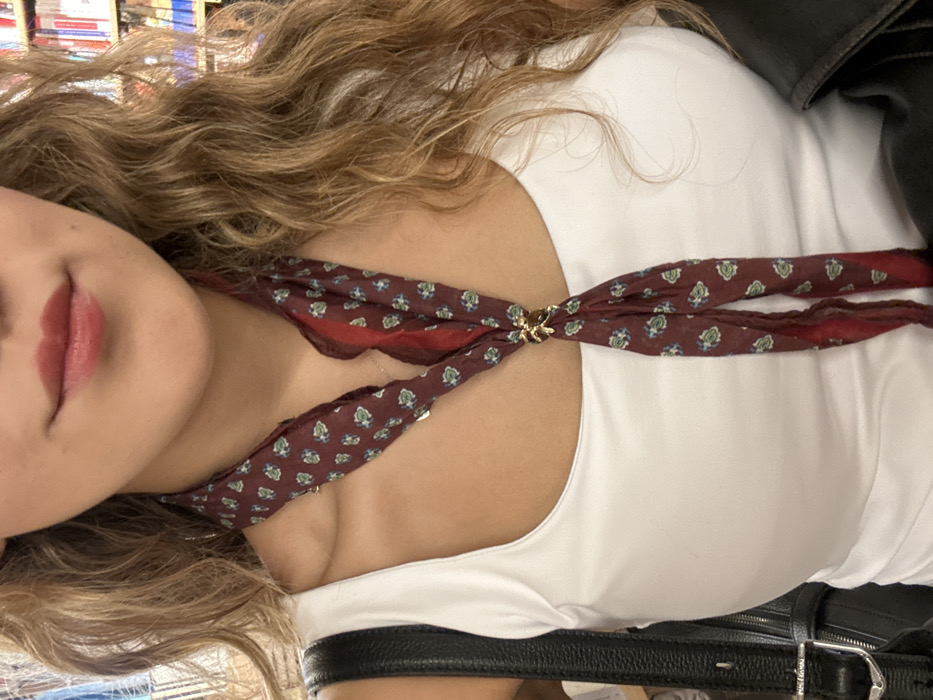 A close-up image captures a person, likely female, from the chest up, positioned indoors within what appears to be a bookstore in Madrid, Spain. The subject has wavy light brown hair and fair skin. She is wearing a white sleeveless top. Around her neck is a dark red patterned scarf with small blue and green floral motifs, secured by a gold-colored scarf ring. A thin, delicate silver chain is visible on her neck below the scarf. Red lipstick is present on her lips. A black leather shoulder bag with a silver buckle is visible on the left side of the frame, draped over her left shoulder. The background is out of focus, showing shelves densely packed with books, consistent with a retail book environment.