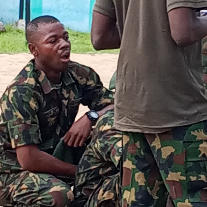 A group of soldiers in camouflage uniforms gather outdoors. One soldier kneels, his mouth open as if speaking or singing. He wears a watch on his left wrist. Another soldier stands partially in the foreground, wearing a plain olive-green shirt and camouflage trousers. Greenery is visible in the background, along with a glimpse of a turquoise and white structure. The scene suggests a training exercise or downtime for military personnel.