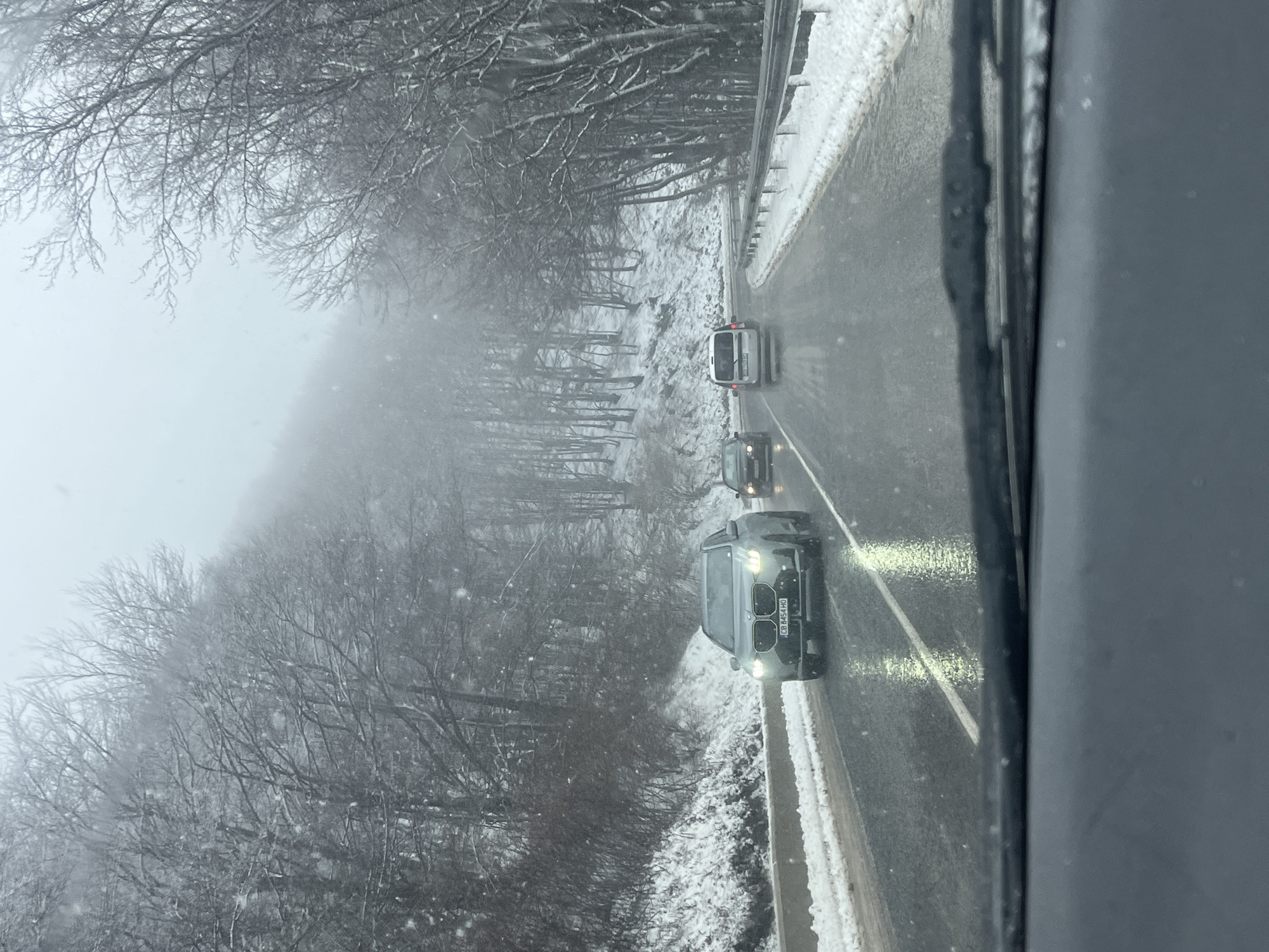 view from inside a vehicle, likely a car, traveling on a road in a snowy, possibly mountainous or forested region