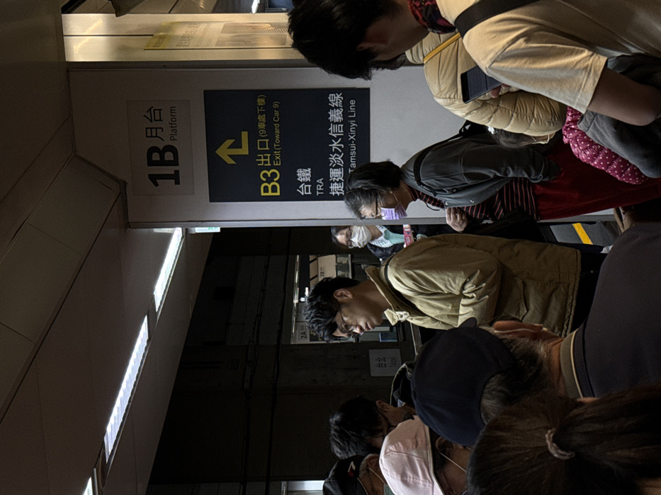 A crowd of people stands beneath a sign indicating "Platform 1B". The sign also directs individuals toward "Exit B3 (Toward Car 9)" for the TRA (Taiwan Railways Administration) and the Tamsui-Xinyi Line. Additional signage displaying numbers 2A and 28 is visible. The setting appears to be a subway station or transit hub.