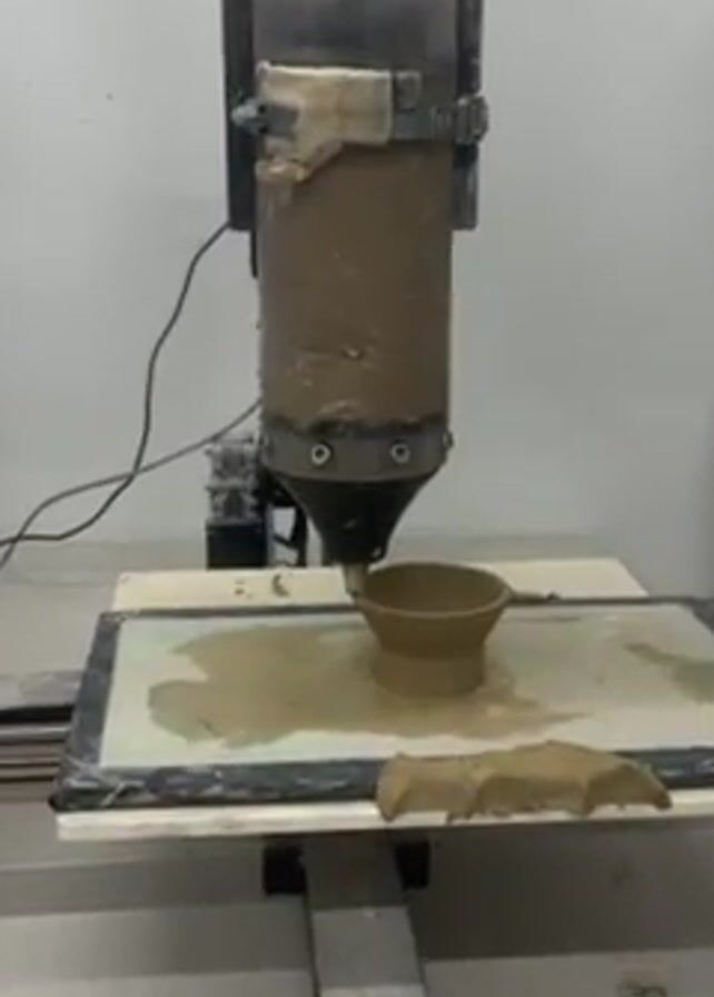 machine extruding clay onto a rotating platform to create a small pot