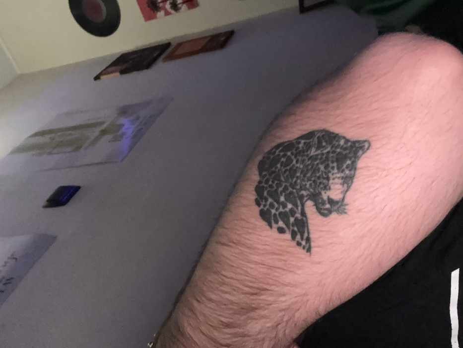 The scene depicts an interior setting, identified as a room within the city of Svilengrad, Bulgaria. A close-up view focuses on a human arm, specifically the upper arm and a portion of the forearm, exhibiting fair skin and light-colored hair. A dark, possibly black, short-sleeved garment is visible near the subject's shoulder. A prominent black tattoo is situated on the upper arm, illustrating a stylized head or creature with a distinct, mottled pattern resembling scales or a leopard-like skin texture. The design includes an eye-like feature and a pronounced profile. The background consists of a light-colored wall adorned with several decorative elements, including at least two vertical posters or framed prints, a small dark blue diamond-shaped object, a black circular object resembling a vinyl record, and a rectangular framed image depicting palm trees against a reddish background. The room is illuminated by artificial, subdued lighting.