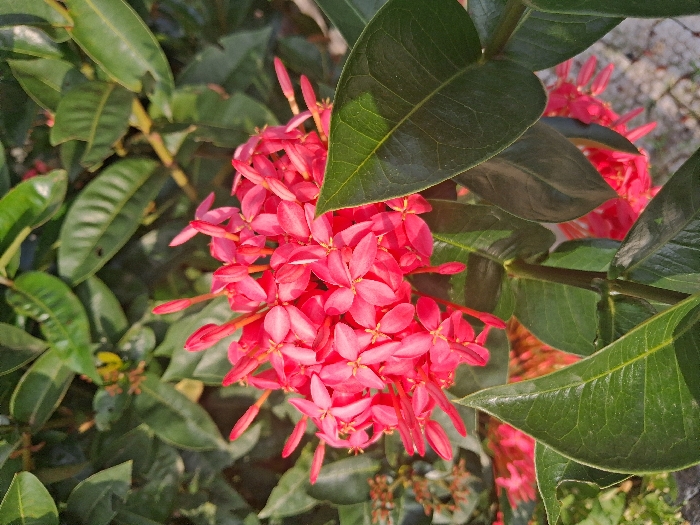 - "The image depicts a close-up view of a cluster of bright red-pink flowers with accompanying green foliage, set in the city of Takum, Nigeria" by FM-IiHJp1, licensed under CC BY 4.0