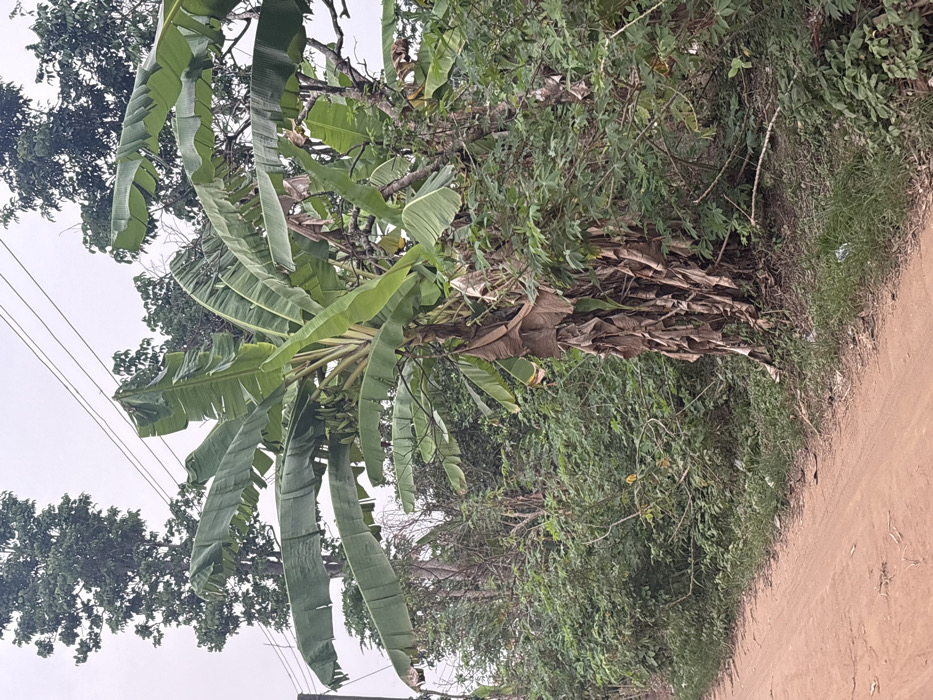 This image depicts a roadside scene in Ikot Ekpene, Nigeria, characterized by dense tropical vegetation under an overcast sky. A reddish-brown dirt road with visible impressions, possibly from tires, runs along the left and bottom foreground. Adjacent to the road, on the right, stands a prominent banana plant featuring large green leaves and a base enveloped by dried, brown leaves. Bunches of bananas are visible among the green foliage. Behind and surrounding the banana plant is a thick expanse of various green shrubs and taller trees, forming a dense natural barrier. Overhead, multiple utility lines span the scene, connected to a partially visible utility pole on the far left. Scattered small pieces of white litter are present on the ground near the edge of the dirt road. No people, animals, or explicit actions are visible within the frame.