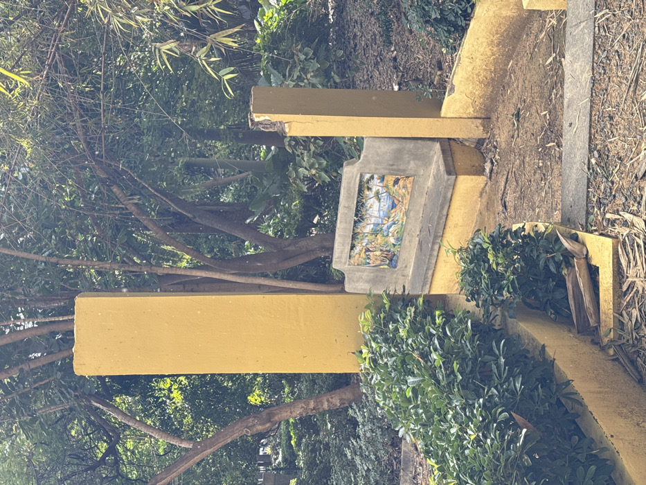 The image displays a segment of a park or garden in Santa Cruz de Tenerife, Spain, under natural daylight. The central feature is a gray-toned concrete bench with a rectangular mosaic tile panel on its backrest. The mosaic depicts a landscape scene featuring green trees, a body of water, and a blue sky. This bench is positioned between two vertical, mustard-yellow painted concrete pillars. The left pillar is intact and taller than the right. The shorter right pillar exhibits significant chipping and material exposure at its top edge. A low, curved mustard-yellow concrete wall, functioning as a planter, contains dense green shrubbery in the foreground and extends towards the pillars. The ground consists of dirt and scattered organic debris, including broken wood pieces in the planter, with some gray paving visible in the lower right. The background is characterized by numerous mature trees and varied green foliage, including bamboo-like plants on the right. No individuals or animals are present.