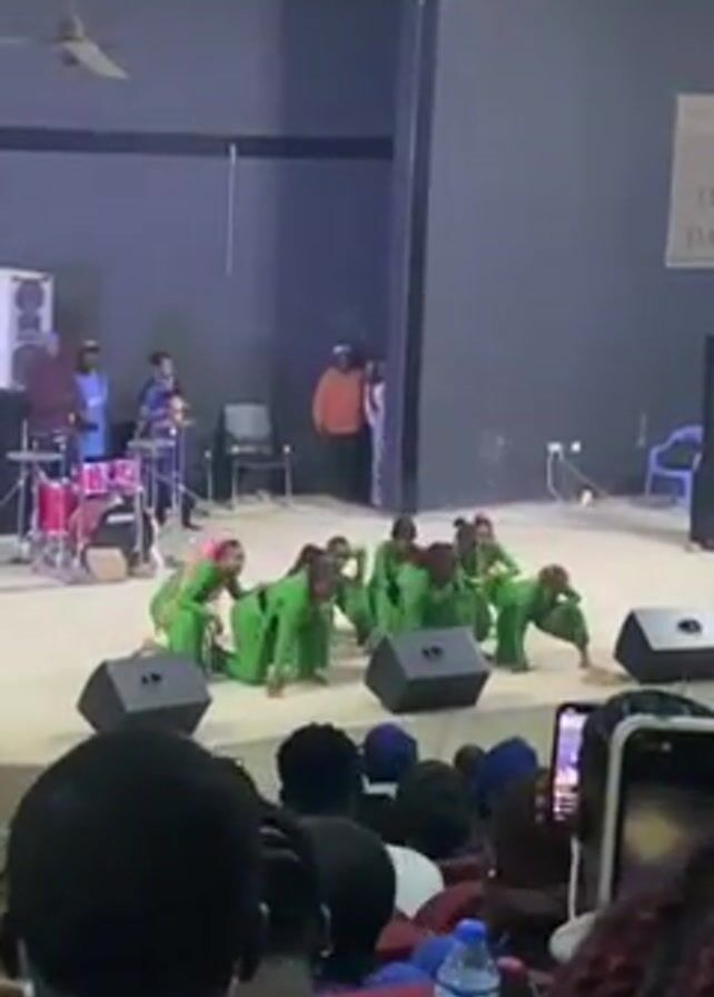 The scene captures a dynamic dance performance on a brightly lit stage. A group of approximately twelve dancers, clad in bright green outfits and varying hair accessories (pink, orange, yellow), execute choreographed moves in unison, punctuated by a band behind them including a drummer with a small pink drum kit. A DJ stands near the band. A small audience, visible primarily in the foreground, films the performance using their phones and cheers the dancers on, holding their arms in the air. The room seems to be an indoor event hall with a ceiling fan, with audio equipment (speakers) situated on stage, and a banner in the background is only partially visible. Overall the atmosphere seems energetic and lively.