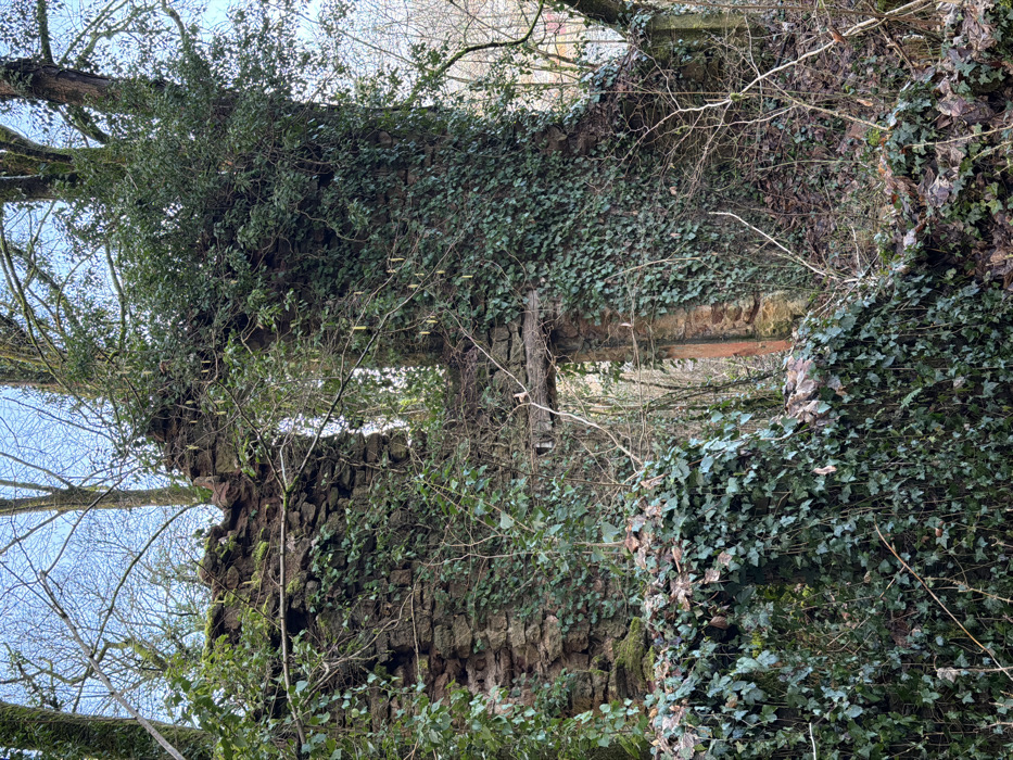 The image depicts the ruins of a stone structure located within a wooded area in Pétange, Luxembourg. The walls, constructed from irregular dark-toned stones, are heavily overgrown with dense, dark green ivy. Significant sections of the upper walls are absent, indicating advanced decay and collapse. A central opening, consistent with a former doorway or large window, features a partially intact wooden lintel. The surrounding environment comprises numerous bare deciduous trees and some evergreen foliage, with yellowish catkins visible on several branches. The ground and lower wall sections are covered in ivy, fallen leaves, and natural debris. No individuals, fauna, or artificial objects are present in the scene.