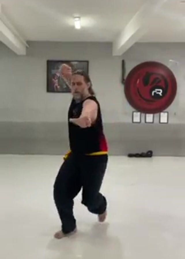 A man wearing a black tank top, black pants, and a yellow belt is practicing martial arts in a gym. He is barefoot on a light gray floor. The man has long hair, a beard, and a tattoo on his upper left arm. He stands in the center of the frame. In the background is a gray wall with a black and white photo and a red logo with white writing. There are some weights along the wall. The room is brightly lit from overhead lights. The camera remains stationary.