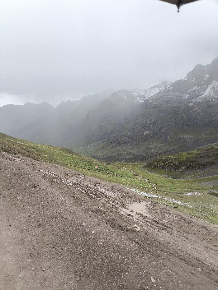 A muddy, rock-strewn slope descends into a valley surrounded by towering mountains shrouded in mist