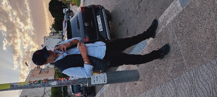 The scene depicts an urban street, likely during late afternoon or early morning given the warm light filtering through an overcast sky. A male individual stands on a speckled and patterned concrete sidewalk, leaning slightly to his right. He wears a black baseball cap with a red emblem, a light blue long-sleeved collared shirt, a black quilted sleeveless vest, dark trousers, and black sneakers. On his left wrist, he wears a watch and bracelets, with additional bracelets on his right wrist. He is holding a cylindrical object, consistent with a cigarette, between the fingers of his right hand near his mouth, with a plume of smoke visible. His left hand holds a small white cup. To the left of the individual is a gray utility pole adorned with various red and white stickers or tape. Behind him, a black Volkswagen T-Roc SUV is parked on the street, displaying a Moroccan license plate "1A195-215". Further down the street, additional parked vehicles and multi-story residential or commercial buildings are visible. On the far right, a red fire hydrant-like object is present on the pavement. The overall environment is an active urban thoroughfare. The setting is consistent with an urban area in Morocco, as indicated by the vehicle's license plate. While the request specifies Fez, Morocco, the exact street or neighborhood within the city cannot be definitively identified from the available visual information.