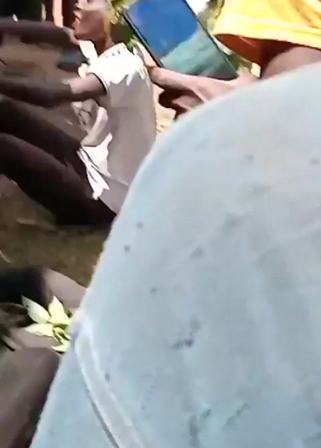 People are gathered outdoors, some sitting on the ground, others standing around them. Several people appear to be in distress, reaching out and crying. Some of the standing individuals are holding leafy branches. There are items like blue plastic jugs and clothing scattered around. A person in a yellow shirt with a number on the back is partially visible in the foreground.