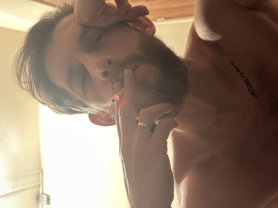 An upside-down view captures a shirtless, fair-skinned man with a beard and dark hair. He is holding a lit cigarette to his lips, and a wedding band is visible on his finger. A tattoo is visible on his upper torso. The background is blurred and indistinct. Lighting is bright, creating a hazy effect.