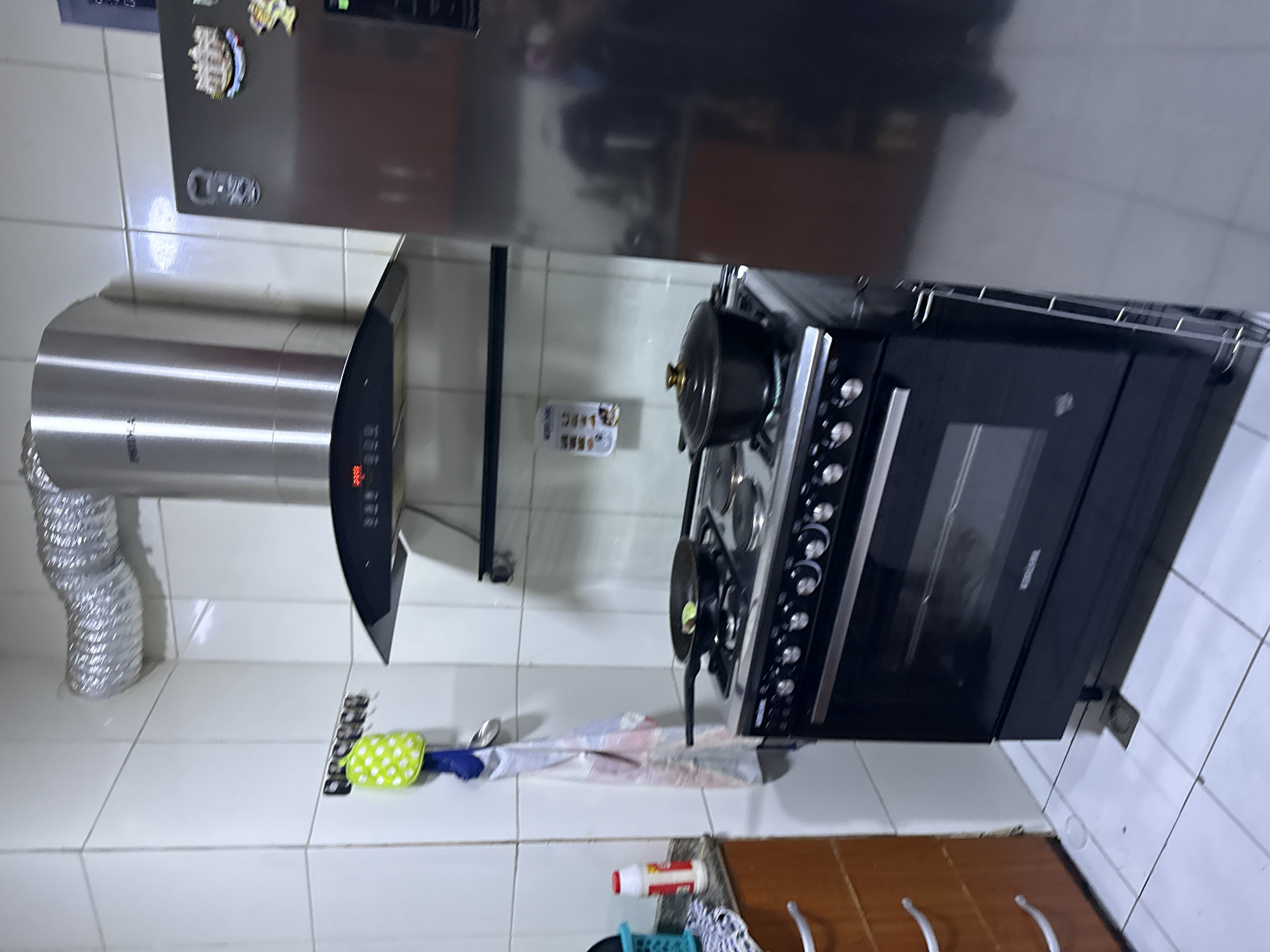 This image depicts an indoor kitchen located in Alaguntan, Nigeria. The environment consists of white tiled walls and a white tiled floor featuring a visible drain cover. A black free-standing gas/electric cooking range is centrally positioned, equipped with an oven and multiple burners. On the front-left burner, a black frying pan contains a light-colored food item. On the rear-right burner, a black pot with a gold-knobbed lid is situated, exhibiting a faint blue flame, indicating active cooking. Above the range, a stainless steel range hood with a curved glass front displays the time "23:09" in red digital characters. A corrugated silver flexible duct extends from the range hood along the upper-left wall. To the right of the cooking range stands a dark-colored refrigerator with several magnets affixed to its front surface. To the left of the range, a light brown wooden cabinet unit with three visible drawers supports a countertop. On this countertop, a blue plastic basket and a white bottle with a red cap are present. A rack with five hooks is mounted on the wall above the countertop, from which a green polka-dotted oven mitt, a blue cloth, and a patterned towel are hanging. A dark, narrow shelf is mounted on the tiled wall above the cooking range. A white rectangular object with various small pictures or magnets is affixed to the wall adjacent to the refrigerator. No individuals are visible in the scene.