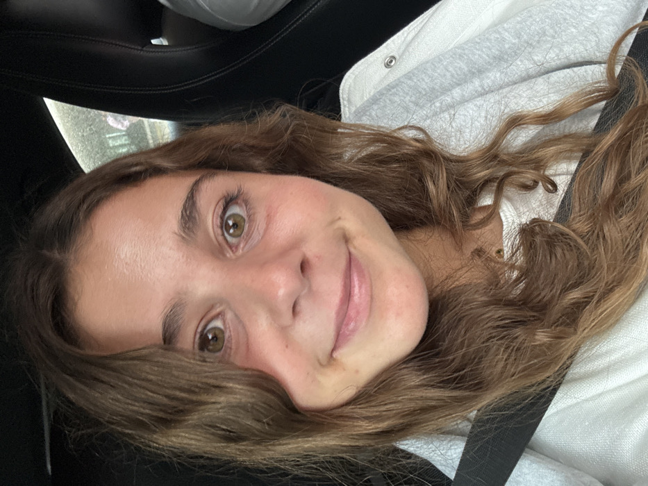 The image displays a close-up, chest-up portrait of a young female inside a vehicle in Senhora da Hora, Portugal