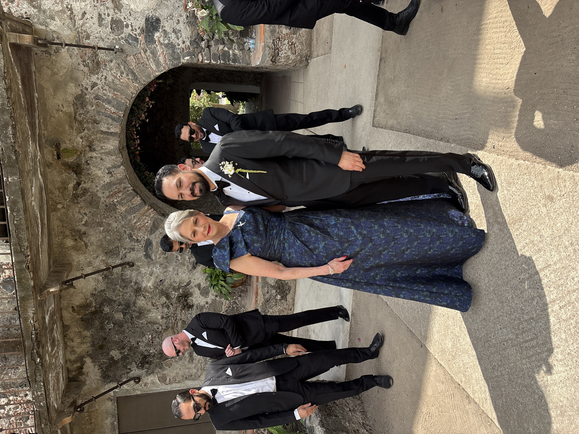 A photograph depicts a group of people, likely attending a formal event such as a wedding, standing in front of a stone archway