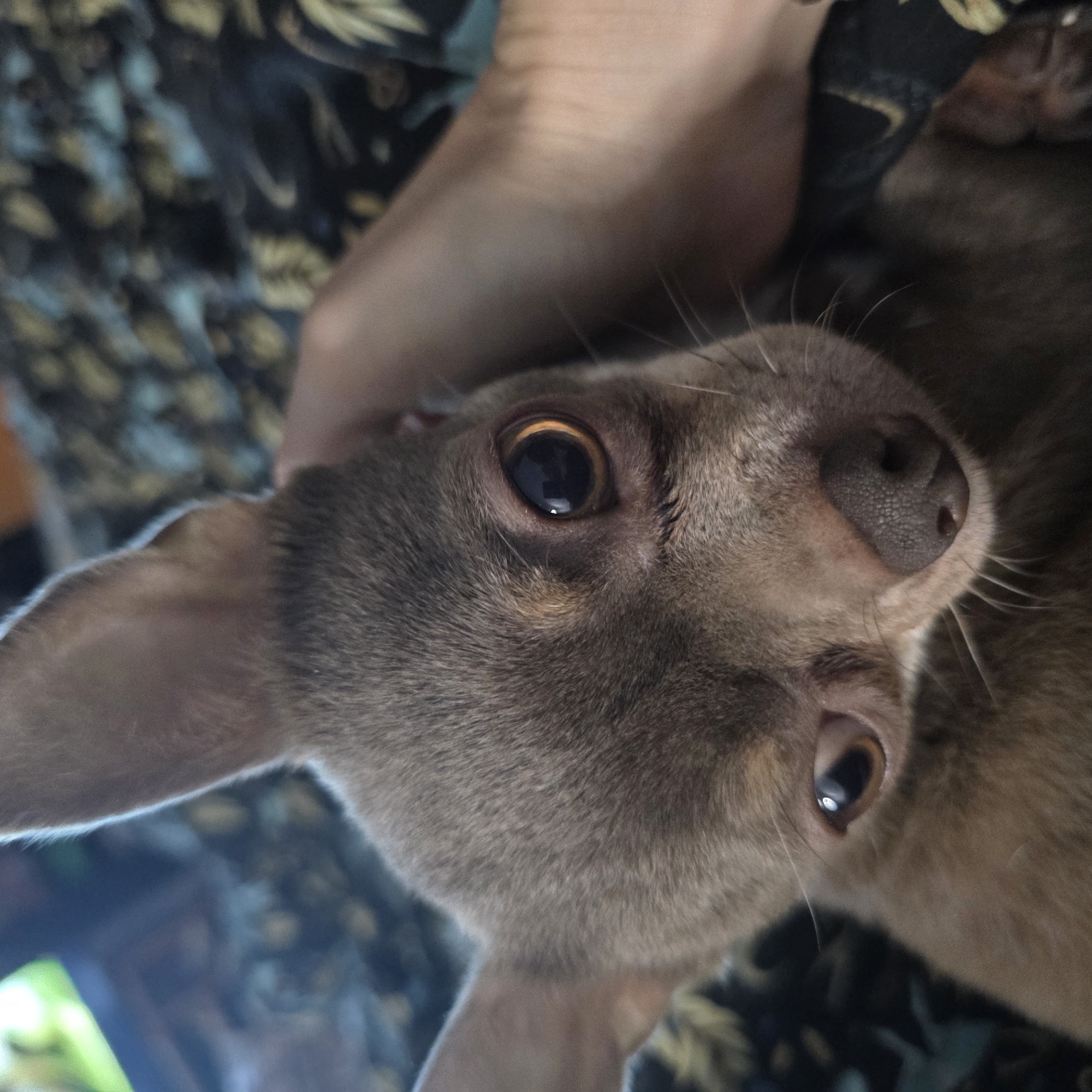 A close-up shot features a light brown chihuahua being held in someone's hand. The dog's head is tilted, showing its large, dark eyes and textured nose. The background appears to be a patterned cloth. There are no indications of the location being Saint Petersburg, Russia.