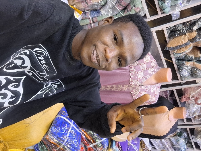 An indoor scene depicts a male individual in the foreground within a commercial clothing establishment, likely a shop or market stall in Fagge A, Nigeria
