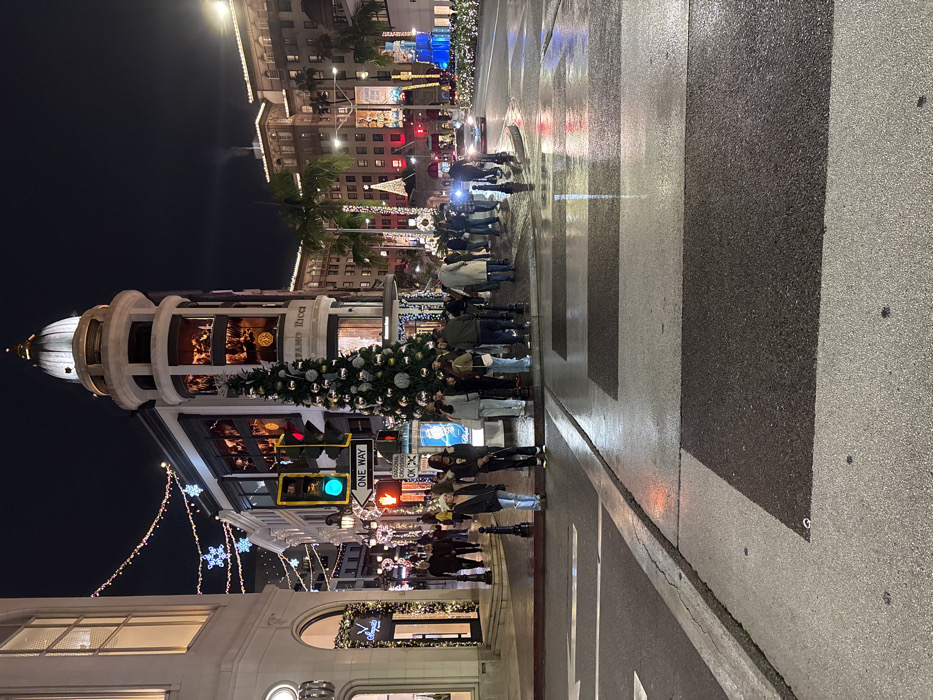 A nighttime street scene focuses on a crosswalk. The road is wet, reflecting lights. Buildings, decorated with snowflakes and holiday lighting, line the street. One building has a distinctive rounded dome structure. A Christmas tree is prominently displayed outside. Pedestrians are visible crossing the street. A traffic light displays green. A "One Way" sign is visible.