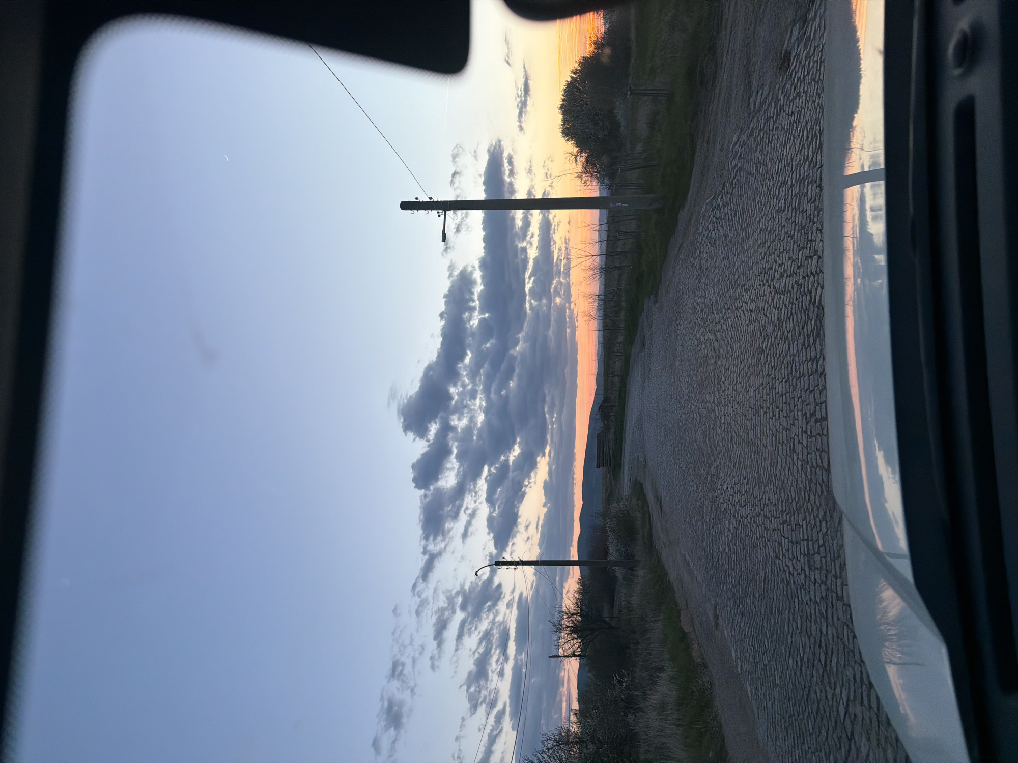 The image depicts a rural scene taken from inside a vehicle, likely a car. The location appears to be in or near Marchaevo, Bulgaria, based on the presence of stone-paved roads typical of the region. The sky is a gradient of blues and oranges, indicating either sunrise or sunset. There are utility poles and wires running along the side of the road. Clouds are present, some darker and more defined than others. The road itself is constructed from irregularly shaped stones. Patches of grass and low-lying vegetation line the roadside. The image is framed by the vehicle's window and door frame, with the reflection of the sky visible on the glass. A thin crescent moon is visible in the sky. There are no people visible in the frame.
