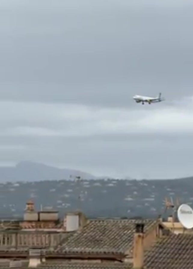 white and yellow airplane approaching for landing. The plane is flying in front of a background of rolling hills and mountains on a cloudy day. In the foreground are red-tiled roofs of buildings, with a white satellite dish visible on one. The plane gradually descends closer to the ground as it approaches.
