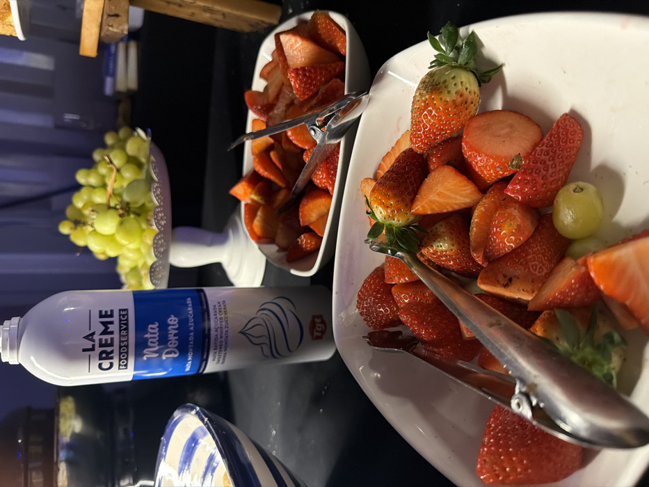 A buffet-style table display presents a variety of fresh fruits. Two bowls, one with strawberries and the other with sliced strawberries, sit next to a pedestal dish holding green grapes. A can of La Creme Nata Dorno whipped cream is conveniently placed nearby. Silver tongs are included for serving the fruits, adding to the inviting arrangement.