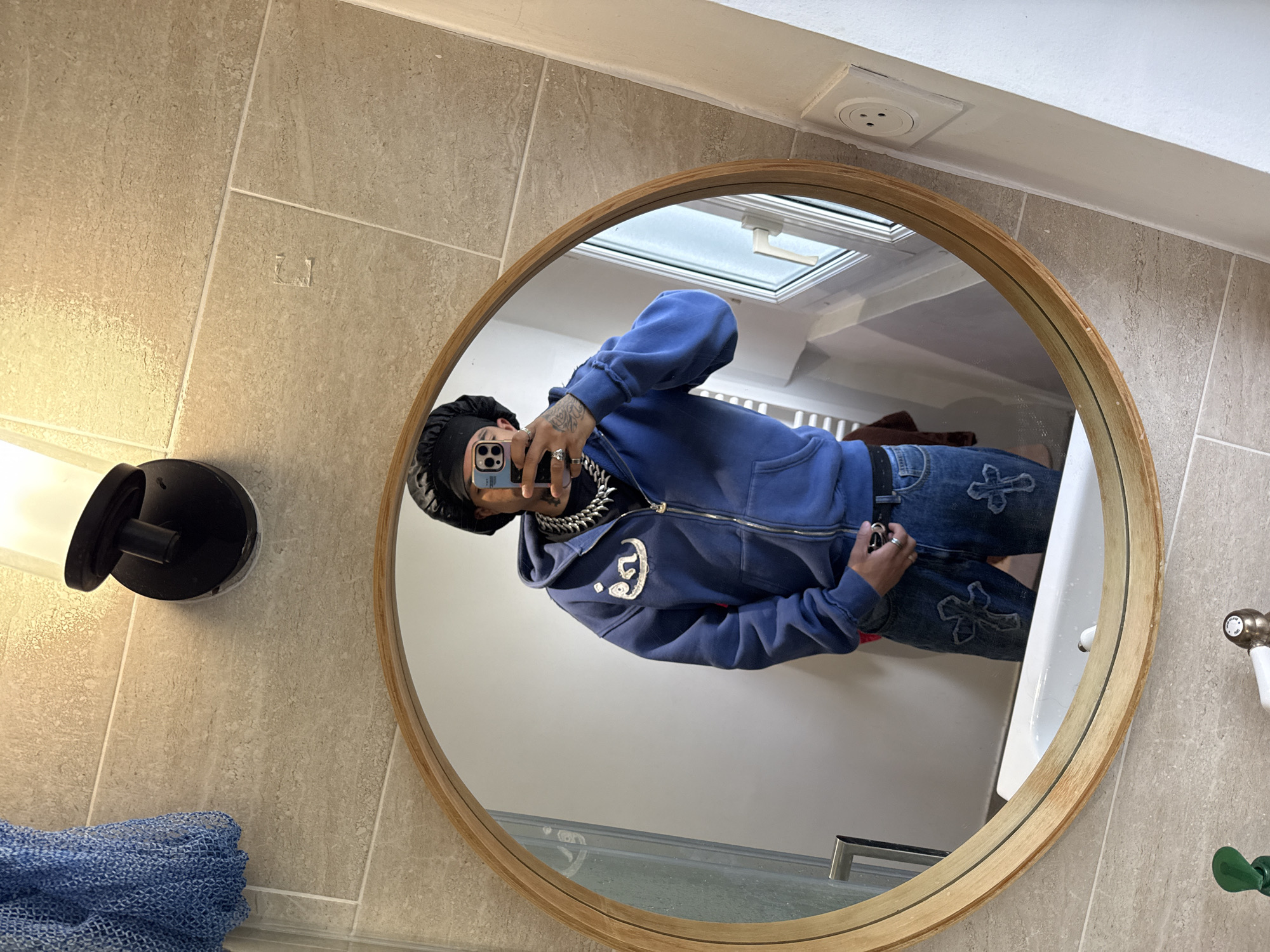 A person stands in a bathroom in Massy, France, visible in the reflection of a round mirror. They are wearing a blue zip-up hoodie with a white design, jeans with cross patterns, and a black head covering. They are holding a smartphone and taking a selfie. A silver chain is around their neck. The bathroom features tiled walls, a sink, a black sconce light fixture, and a blue mesh item. A skylight is visible through the mirror. An electrical outlet is positioned near the top of the mirror. The mirror has a wooden frame.