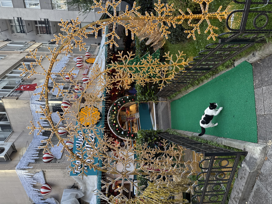 The image displays the festive outdoor entrance of "Teo Usta Waffles," a dessert shop located in Kadıköy, Turkey. A black and white domestic cat is positioned mid-stride on a narrow green mat, walking from left to right towards the shop entrance. The mat is bordered by low black wrought-iron fences and green hedges, and framed by a large golden archway composed of numerous illuminated snowflake-shaped lights. Additional illuminated snowflake displays stand vertically along the path. The shop features a teal-colored awning displaying the name "Teo Usta Waffles" in white text. Above the awning, the building facade is decorated with white string lights resembling icicles, several red and white striped hot-air balloon ornaments, and a prominent golden snowflake-like light fixture. A smaller, internal archway leading into the shop is adorned with green garlands, red and silver baubles, and lights. Inside, display cases filled with various desserts are visible. A person wearing a dark top is partially discernible inside the shop to the right. A small Turkish flag is affixed to the building facade above the shop entrance. The surrounding environment consists of multi-story buildings, characteristic of an urban setting. The foreground shows a grey concrete sidewalk where the green mat begins.