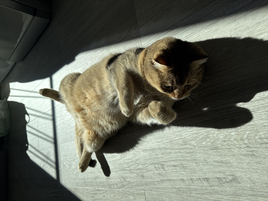 The scene is an indoor environment, specifically identified as l'Hospitalet de Llobregat, Spain. A single golden-brown domestic cat is depicted lying on its back on light grey wood-effect laminate flooring. The cat's ventral side is exposed, with its limbs slightly flexed. Its head is oriented to the right of the frame, resting in a relaxed posture within a patch of direct sunlight. Strong, directional sunlight enters from an unseen window, casting distinct parallel linear shadows across the floor and partially over the cat's body, indicative of window grates or blinds. The cat itself casts a discernible shadow. In the upper right background, a portion of a light-colored appliance or piece of furniture is partially visible, along with a faint shadow outline consistent with a hanging bag.