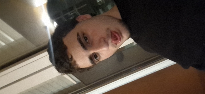 A light-skinned man with short, dark, curly hair and dark eyebrows is looking down at the camera with his mouth slightly open. He's wearing a black shirt. The background includes a window with white horizontal slats and a tan-colored wall. The image is slightly angled. There's a light source visible at the top of the frame.