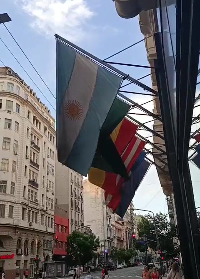 street scene in a city, with a variety of flags hanging from a building awning. The most prominent flag is the Argentinian flag, with its light blue and white stripes and a yellow sun in the center. Other flags, appearing to be other nations' flags, are also visible, but obscured by the Argentinian flag. The street is active with people walking along the sidewalks, and cars are moving along the road. Buildings line the street, a mix of older architectural styles and more modern structures. The sky is partly cloudy, with patches of blue visible. A man wearing a dark shirt and a white hat is walking in the foreground.