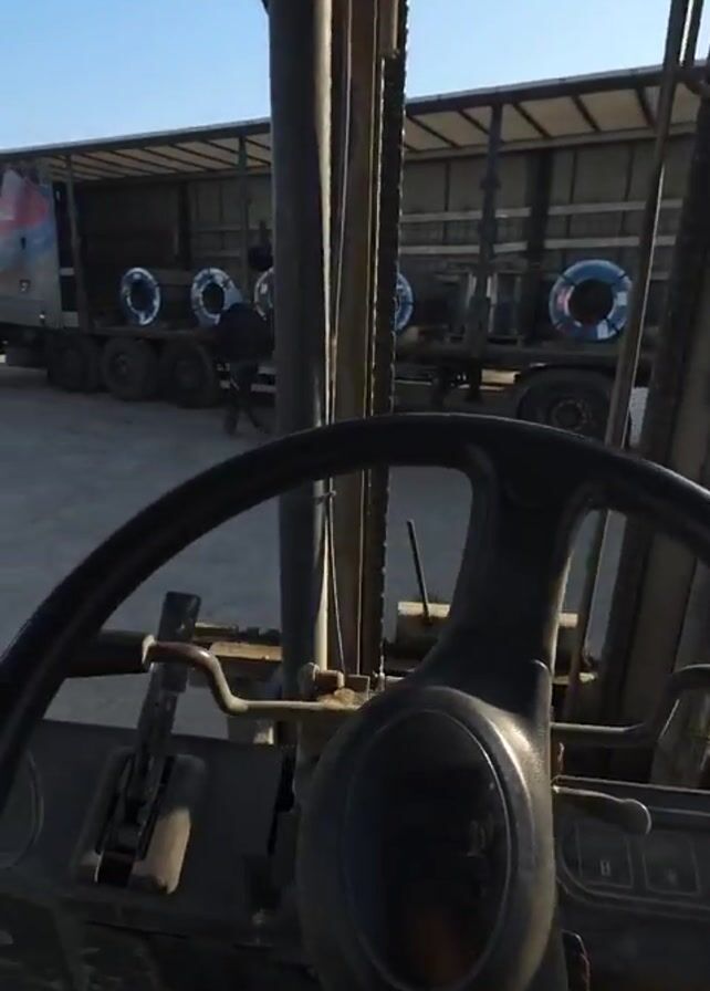 view from inside a forklift. The camera is stationary, looking out through the metal frame of the forklift. A black steering wheel is visible in the foreground. Through the forklift’s frame, two people are seen standing near the open back of a large truck trailer. The truck trailer has several round, blue and white objects hanging inside. The people appear to be wearing dark jackets. The ground is concrete, and the sky is light blue.