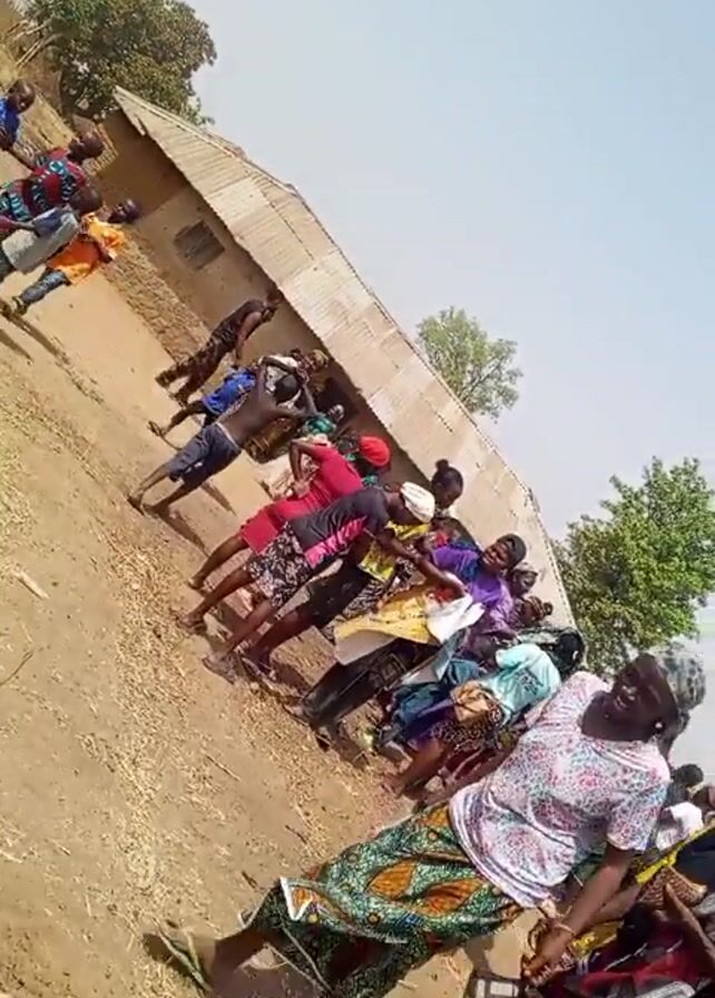 A group of people is standing and dancing in an outdoor setting, likely a village or rural area, on a sunny day