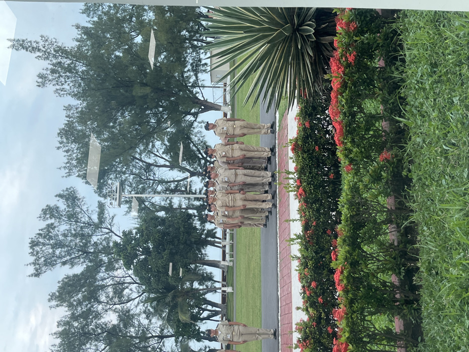 The scene is an outdoor formal gathering in Veracruz City, Mexico, under an overcast sky. Thirteen individuals in uniform stand at attention within a landscaped park environment. In the foreground, a manicured lawn of green grass leads to a low hedge row displaying numerous red flowering plants. To the right, a large variegated agave plant is prominently featured. A paved pathway with a red brick border runs horizontally across the midground. On this paved area, one female individual, dressed in a tan military-style uniform with a dark cap and dark shoes, stands rigidly at attention on the far left. To her immediate right, twelve male individuals, similarly dressed in tan uniforms, dark caps, and dark shoes, are arranged in a tight formation, also standing at attention. They occupy a section of the paved area adjacent to an expansive, well-maintained green lawn. The background is dominated by numerous tall trees, including what appear to be conifers and palm trees, lining a distant shoreline. A segment of the ocean is visible beyond the trees. Several tall, slender light poles, each fitted with multiple flat, rectangular light fixtures, are interspersed among the trees.