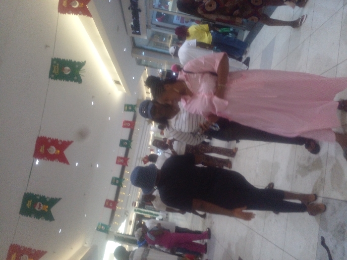 The image depicts the interior of a brightly lit shopping mall in Lagos, Nigeria, adorned with festive decorations