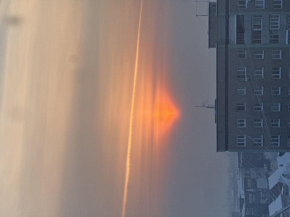 This image captures a winter sunrise or sunset over Krasnoyarsk, Russia, looking towards the vicinity of the Sportpark Atletika complex at Ulitsa Shakhterov, 49Zh. The upper half of the frame is occupied by a sky displaying a gradient of pale grey-blue at the horizon, transitioning to soft orange and pink hues higher up. A prominent, intensely bright orange light source, presumed to be the sun, is visible low in the sky, exhibiting a distinct, somewhat triangular or V-shaped appearance. A narrow, linear white contrail extends horizontally across the sky, positioned below the sun. Several faint, circular hazy spots are discernible in the upper sky. In the lower right quadrant, a multi-story, grey concrete residential building is visible, featuring multiple rows of rectangular windows. Its flat roof is equipped with several antennas, some of which appear to be covered in frost or snow. Overhead utility lines or cables crisscross the midground, obscuring parts of the view. In the midground, further to the left, other buildings are present, including one with a large sign displaying "SPORTPARK" and "ATLETIKA". The ground and various building rooftops throughout the midground are covered in a uniform layer of white snow. No individuals or specific actions are observable within the frame.