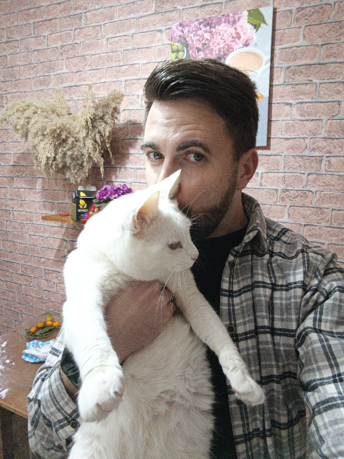 - "A man with dark hair and a beard holds a white cat against his chest" by FM-YVp303, licensed under CC BY 4.0