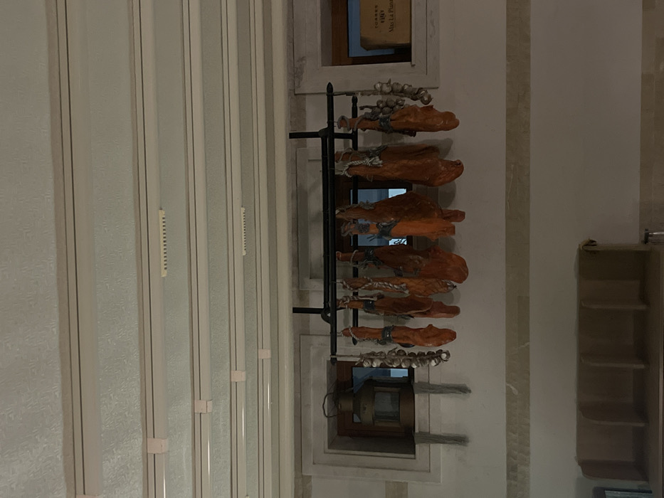 The scene depicts an interior setting, identified as being in Balchik, Bulgaria. The upper third of the image shows a light-colored ceiling with five parallel white track lighting fixtures, each featuring small, rectangular ventilation or lighting inserts. Below this, a light-toned wall section contains two symmetrically placed rectangular window-like openings with dark frames. The left opening displays an antique-style brass lantern. The right opening contains a light-colored wooden box with text including "TORRES / 1989 / Mas La Plana". A black, horizontal metal rack is suspended below the ceiling fixtures and between the window openings. From this rack, nine reddish-orange cured meat legs, likely hams, hang by ropes. Additionally, two braids of white garlic bulbs are suspended from the rack, positioned to the left and right of the cured meats. The lower half of the wall is light-colored, featuring a horizontal decorative band of lighter and darker beige or gray tiles/strips. At the bottom-left of the image, a portion of a low, light-brown, multi-compartment shelving unit or bench is visible. No individuals are present in the depicted scene.