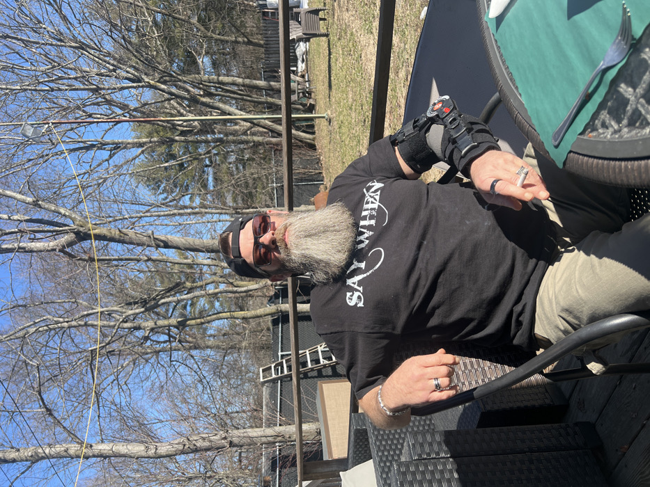 An adult male is seated outdoors on a wooden deck in the City of Newburgh, United States of America, on a clear, sunny day. The man has a full grey-white beard, wears dark sunglasses and a black baseball cap reversed. He is dressed in a black t-shirt with "SAY WHEN" printed in white, and khaki-colored pants. A black and grey elbow brace is affixed to his right arm. He holds a lit cigarette between the index and middle fingers of his right hand, which also bears a silver-colored ring on the ring finger. His left wrist has a silver bracelet, and his left hand displays two rings, one on the index finger and one on the ring finger. He is seated in a dark-colored outdoor chair at a round table, part of which is visible, showing a dark green placemat and a silver fork. In the background, beyond a dark-colored fence, is a grassy yard with numerous bare deciduous trees, and a silver stepladder leans against a structure. A yellow rope or wire is strung between trees, and a utility pole with a light fixture is also visible.