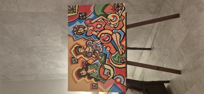 A vertical painting dominates the scene, featuring four stylized female figures. Each woman wears a dress and jewelry. One figure at the top sports a crown. The composition uses bold, curved lines and geometric shapes in vibrant colors. A stylized signature is visible near the top. The painting rests on a gray tiled floor and a wooden structure, possibly a ladder or shelf, is behind the painting.