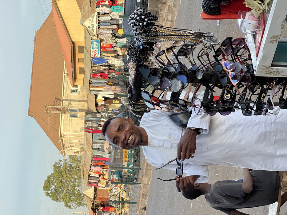 The image depicts an outdoor market scene in Bukuru, Nigeria, under clear daylight conditions. In the foreground, an adult male with dark skin and a broad smile stands prominently, wearing a white traditional tunic. He holds a pair of black sunglasses in both hands, appearing to present them. A watch is visible on his left wrist and a ring on his left ring finger. To his immediate right is a black, multi-tiered rotating display stand laden with numerous pairs of sunglasses of various styles and colors. Adjacent to this, on a separate display, are collections of black and white beaded necklaces, alongside silver-colored chain necklaces with pendants. A young male, also with dark skin and wearing a dark t-shirt, is partially visible sitting on a low wooden stool or bench in the lower-left quadrant, facing away from the camera. The background reveals a bustling street market. A paved road separates the foreground subjects from a row of market stalls with corrugated metal roofs. These stalls are densely packed with clothing items, including colorful shirts, dresses, and trousers, hung for display. A green and white motorized tricycle is visible on the street between the foreground and the market stalls, with a dark vehicle partially obscured further down the street. Beyond the market stalls, multi-story buildings with light-colored facades and prominent brown or terracotta-colored roofs are present, along with utility poles and wires. Green foliage from trees is visible on the left side of the background. A green metal fence runs along the street in front of the market stalls.