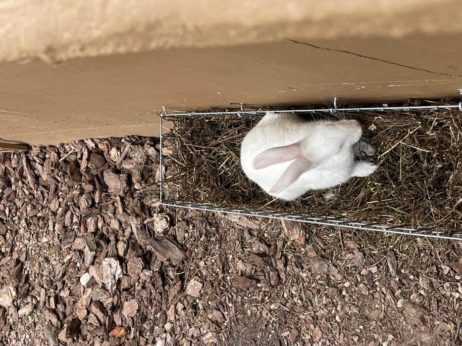The scene depicts an outdoor area in Sant Llorenç des Cardassar, Spain. A single white rabbit with pink ears is observed resting within a rectangular, silver-colored wire mesh enclosure. The enclosure is filled with dry, dark brown hay or straw, providing a bed for the rabbit. The rabbit is positioned with its body facing towards the right side of the frame, and its head is angled downwards. The enclosure is situated on a surface covered with reddish-brown wood chips or bark mulch, and it abuts a vertical, light brown wall. The area is illuminated by direct sunlight, casting subtle shadows. No human subjects or interactions are visible.