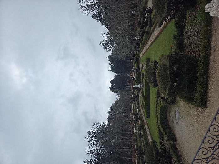 The image displays a formal garden at the Royal Palace of La Granja de San Ildefonso in San Ildefonso, Spain, viewed under an overcast sky. A black wrought iron railing with scrollwork is partially visible in the lower left foreground. The garden features meticulously maintained sections of vibrant green grass, bordered by geometric patterns of trimmed dark green hedges and bushes. Light brown gravel paths interlace throughout the landscape, with visible puddles indicating recent rainfall. Multiple white classical statues, primarily depicting human figures on pedestals, are positioned at various points within the garden beds and along the paths, one being centrally located. Tall, dense trees, some deciduous with sparse foliage and others evergreen, line the perimeter of the garden, creating a backdrop beneath the uniformly grey, cloudy sky. No individuals are present in the scene.
