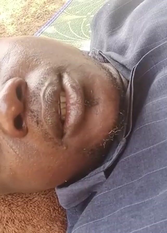 A man is lying down, facing the camera. He has brown skin, short dark hair, and a small beard. He's wearing a blue striped shirt and appears to be outdoors, lying on a brown blanket or mat. Behind the man, there is a green patterned mat and some foliage. The camera is held at an angle above the man. The bottom left corner of the frame displays "Infinix NOTE30Pro". The man opens his mouth slightly but says nothing.
