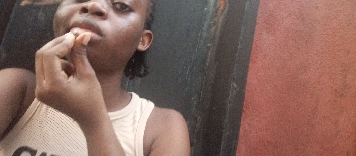 A close-up image captures a young individual, likely female, with dark skin and dark braided hair. The subject wears a light-colored, ribbed tank top, with a partial dark letter visible on the left chest area. The individual's right hand holds a small, light-brown, irregularly shaped object, which is positioned at their mouth, suggesting an act of eating or consumption. The background consists of two distinct vertical elements: a dark, weathered surface, possibly wood, on the left, and a reddish-orange, textured wall on the right. The specific location within Abuja, Nigeria, is not discernible from the visual evidence present in the image.