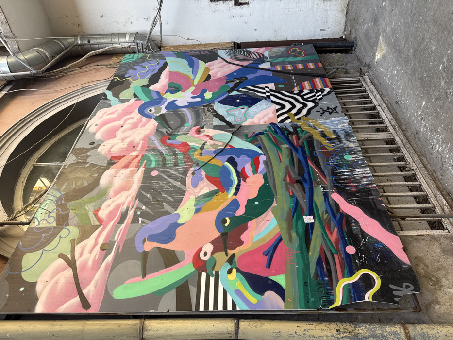 This image captures a vibrant, abstract mural covering a significant portion of an exterior building wall in Novi Sad, Serbia. The central subject is a large artwork predominantly featuring numerous brightly colored, stylized birds in a nest, set against a background of soft pink clouds and dark, abstract shapes. The color palette includes various shades of pink, blue, green, yellow, red, and black, with a notable section on the right displaying black and white striped patterns. The mural is affixed to a textured, weathered building facade. Above the artwork, a reddish-brown wall with a large, arched window structure is visible. To the immediate left, a vertical, tarnished metal pipe runs down the wall. To the right, a contrasting white wall features an exposed metal ventilation pipe and multiple black electrical wires. Below the mural, a rusted metal grate protects a lower-level window or opening. The concrete ground is worn and exhibits scattered white marks. The bottom edge of the mural shows signs of wear, including tears and paint drips, and a small green sticker is present on its lower-left section. No individuals are depicted in the scene.