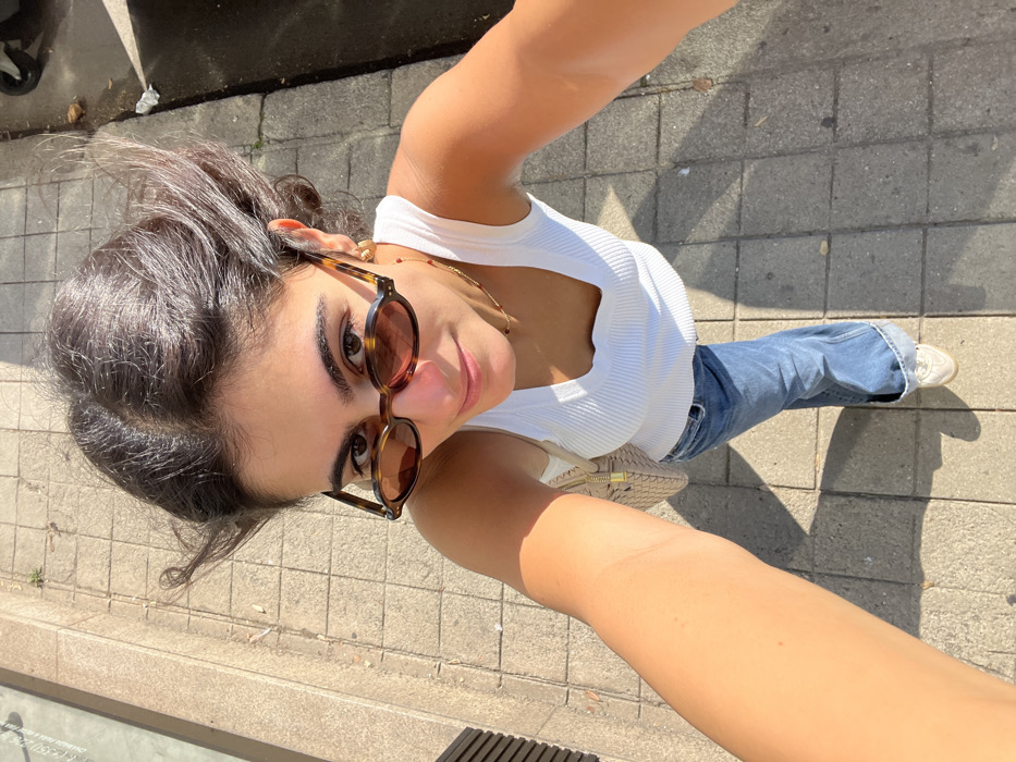 A female individual is depicted in a high-angle selfie taken on a paved sidewalk in Aldoar, Foz do Douro e Nevogilde, Portugal, under direct sunlight. She has dark, windswept hair and wears small, oval, tortoiseshell-patterned sunglasses, directly facing the camera. Her attire consists of a white ribbed tank top, blue denim jeans cuffed at the ankles, and white sneakers. A thin gold-colored necklace with small red beads and a light-colored, textured handbag are visible. The individual's outstretched arm, holding the camera, occupies the foreground. The grey, square-patterned sidewalk shows strong shadows. A dark vertical element of a structure is partially visible on the left, while a portion of a vehicle and minor debris are present on the ground to the right.