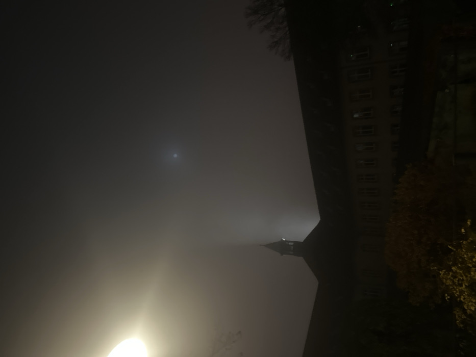 The image depicts a nighttime scene heavily obscured by fog, specifically at the Faculty of Pharmacy, University of Strasbourg, located on Rue de l'Hôpital Civil in Strasbourg, France. A large, multi-story building dominates the lower two-thirds of the frame, characterized by a dark, steeply pitched roof with numerous dormer windows, and a prominent central bell tower/spire that extends upward. The building's facade, likely light-colored, is dimly discernible through the darkness and atmospheric conditions, revealing multiple rows of uniformly spaced windows. A powerful, warm white light source, presumably a streetlamp, emits a strong glare from the upper-left quadrant, illuminating the dense fog and creating a bright halo effect. Another, smaller, bluish light source is visible in the upper-center-right, also diffused by the fog. A vertical beam of light rises directly behind the central spire, suggesting another light source positioned behind or within the building's central structure. The foreground contains dark, dense foliage, possibly bushes or trees, which are largely indistinct due to the low light and fog. No individuals or specific actions are discernible within the scene.