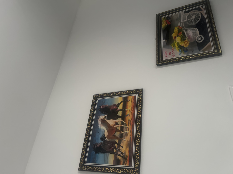The image displays an interior scene, presumed to be within Rumuofa, Nigeria. A plain white wall and ceiling are visible. Two framed pictures are mounted on the wall. The upper-left picture is horizontally oriented, featuring a black frame with intricate gold-colored decorative patterns. Its content depicts three horses in motion: a light-colored horse in the center, flanked by two darker, possibly brown or black, horses. The background suggests a sandy terrain under a multi-toned sky. The lower-right picture is vertically oriented, also encased in a black frame with gold-colored decorative patterns, similar to the first. This picture's content shows a white, decorative, tricycle-shaped planter filled with artificial flowers in shades of yellow, blue, and orange. The phrase "LIFE IS GOOD" is printed in red text on the upper-left portion of this image's content. No individuals are present.