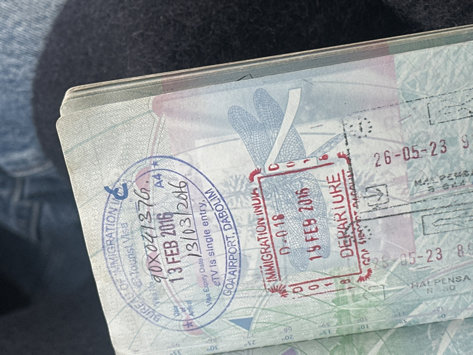 An open passport page is depicted, showing two prominent immigration stamps. The upper stamp is a blue circular seal from the "BUREAU OF IMMIGRATION INDIA," indicating an "eTourist Visa" with a "Date of Arrival 13 FEB 2016" and a "Visa Expiry Date 13/03/2016." This stamp specifies "eTV is single entry" and identifies the location as "GOA AIRPORT, DABOLIM." A handwritten entry, "90X041376," is present within the blue stamp. Below this, a red rectangular stamp, also from "IMMIGRATION INDIA," is visible. This stamp shows "D-018," a date of "19 FEB 2016," and the word "DEPARTURE," likewise attributed to "GOA AIRPORT, DABOLIM." The passport page features faint background security elements, including a stylized light blue dragonfly watermark and subtle map-like grid lines and coordinates. The passport is resting against a blurred, dark blue or black fabric surface, likely clothing or upholstery. The visible geographic information is specific to Goa Airport, Dabolim, India. There are no elements within this image that depict or provide information related to the city of Uttlesford, United Kingdom.