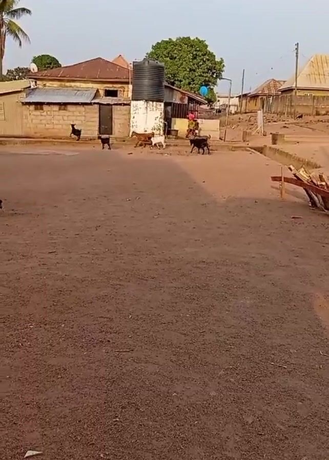 dirt square in a rural or semi-rural setting, with several goats roaming freely